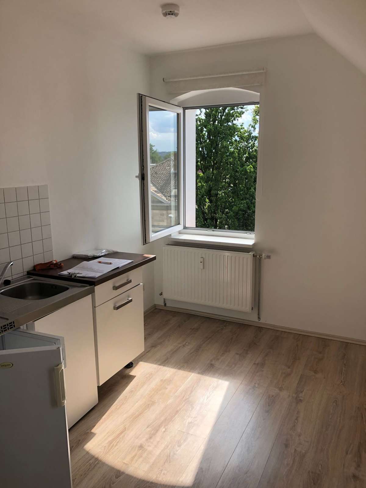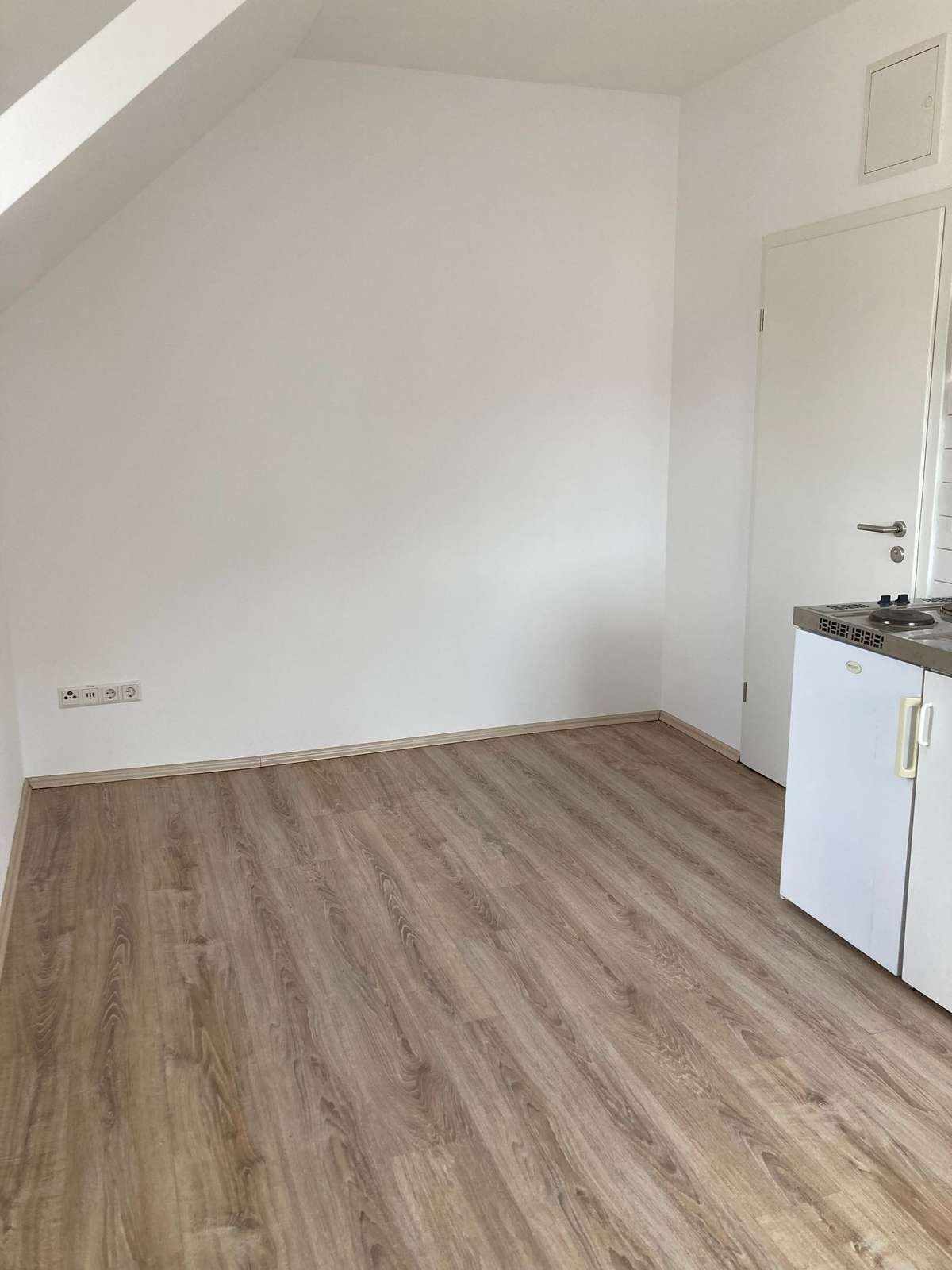 Die gemütliche 1-Zimmer-Wohnung verfügt über einen kombinierten Wohn-/Schlafraum mit einer klassischen Pantryküche. Ein hell gefliestes Duschbad grenzt an.