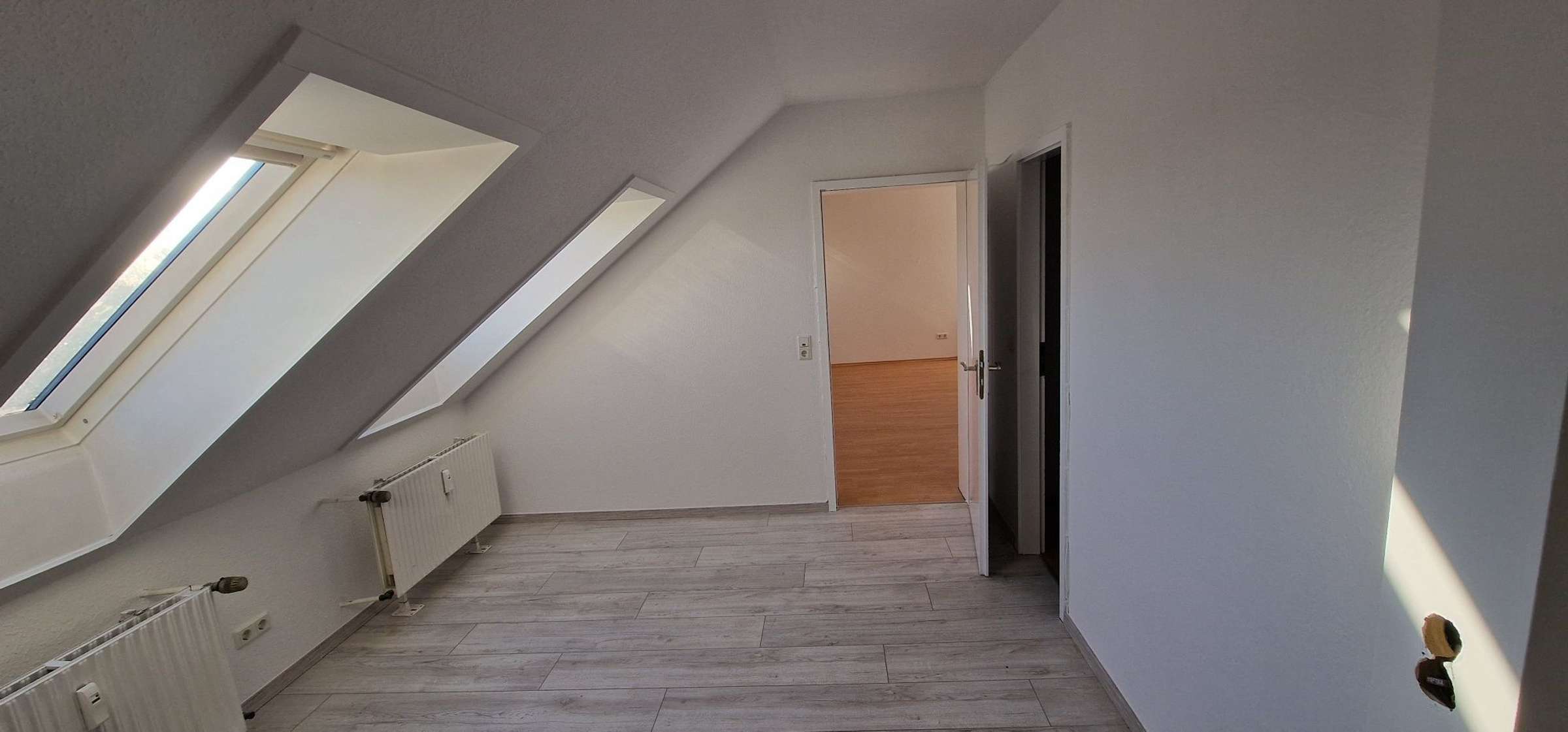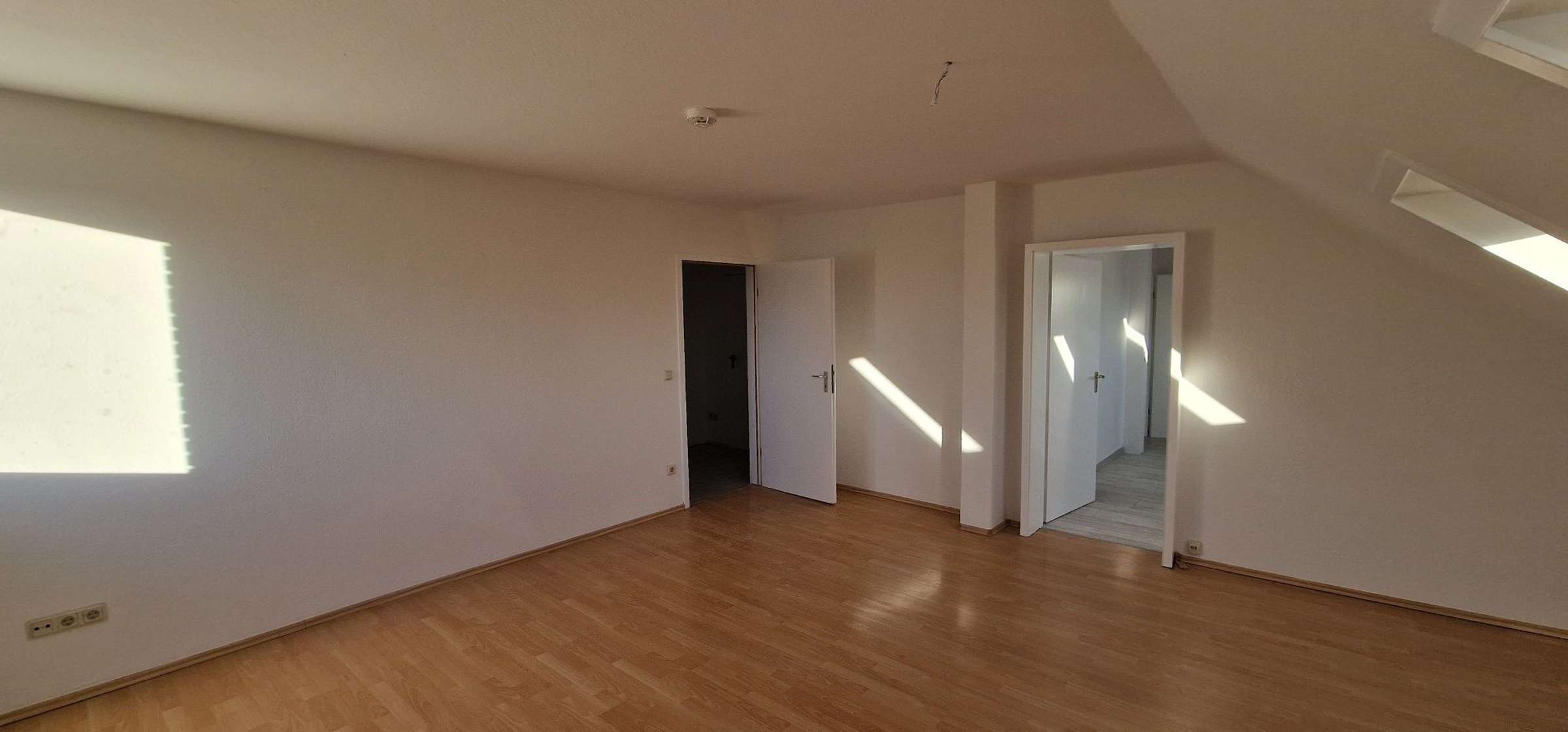 -heller und geräumiger Wohnraum (frisch gestrichen) mit Laminat in Optik "Buch"